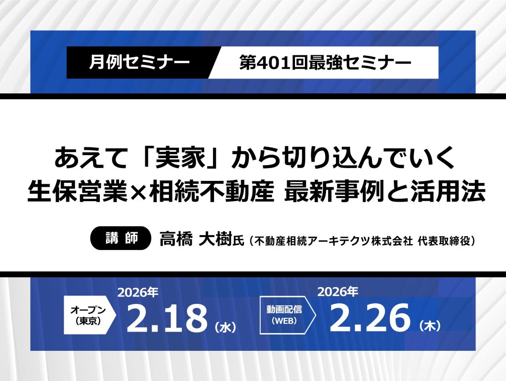※『最強セミナー』は『オープンセミナー』『動画配信』の2種類です。同時中継は行いませんので、予めご了承ください。 ※動画配信は『月1回』行っております。 一般申込で動画配信を選ばれた方は配信日の翌日から一週間に限り再視聴が可能です。 一般申込でオープンセミナーを選ばれた方への動画配信はありませんのでご注意ください。 また、最強倶楽部会員の方は配信日翌日から『会員サイト』にて 無制限に動画をご覧いただけますので、こちらもぜひご活用ください。 【オープンセミナー(東京)】 2026年2月18日(水)13:30~15:45 【動画配信(webセミナー)】 2026年2月26日(木)13:30~15:45 ※動画配信とオープンセミナーの内容は同一です。 | |