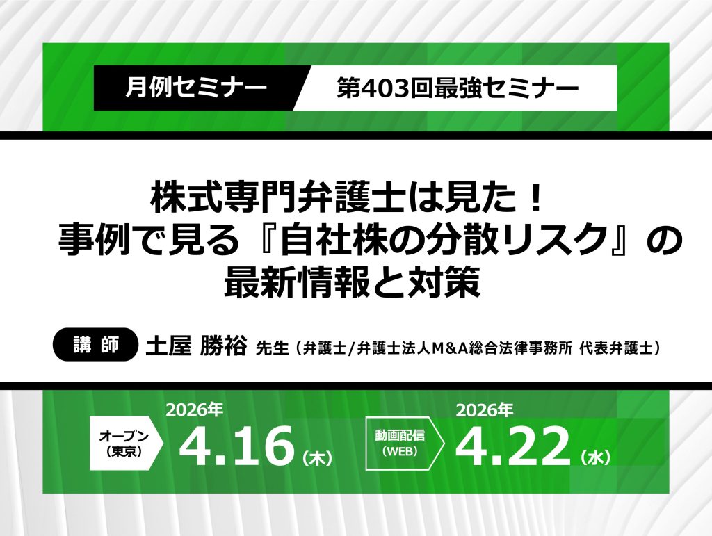 ※『最強セミナー』は『オープンセミナー』『動画配信』の2種類です。同時中継は行いませんので、予めご了承ください。 ※動画配信は『月1回』行っております。 一般申込で動画配信を選ばれた方は配信日の翌日から一週間に限り再視聴が可能です。 一般申込でオープンセミナーを選ばれた方への動画配信はありませんのでご注意ください。 また、最強倶楽部会員の方は配信日翌日から『会員サイト』にて 無制限に動画をご覧いただけますので、こちらもぜひご活用ください。 【オープンセミナー(東京)】 2026年4月16日(木)13:30~15:45 【動画配信(webセミナー)】 2026年4月22日(水)13:30~15:45 ※動画配信とオープンセミナーの内容は同一です。 | |